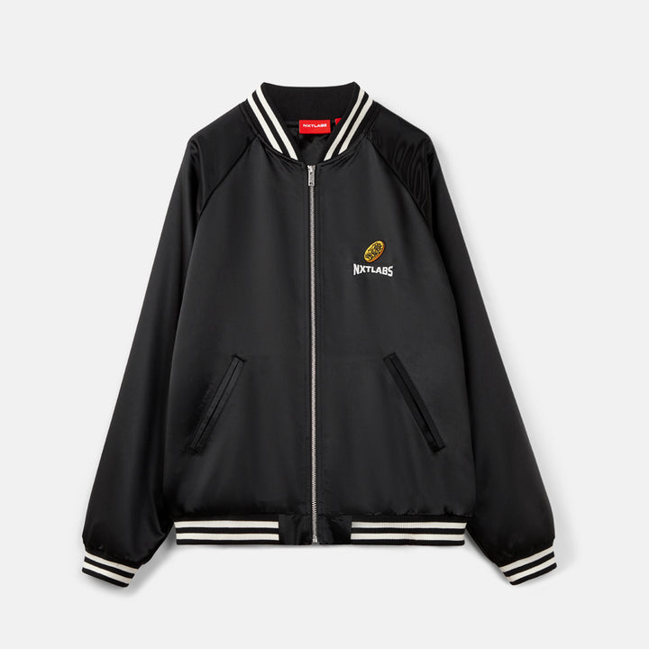NXT Labs proposes prosperity and effortless style in the form of this graphic satin bomber. Designed with dense, multi-color embroideries on the front and back, combining symbols of good fortune, the beckoning Maneki Cat, the koi fish, and a four-leaf clover charged with vibrant detail that glows in the dark. Finished with striped ribbing and silver metal hardware, this bomber is a statement piece made to carry good fortune wherever you go.
