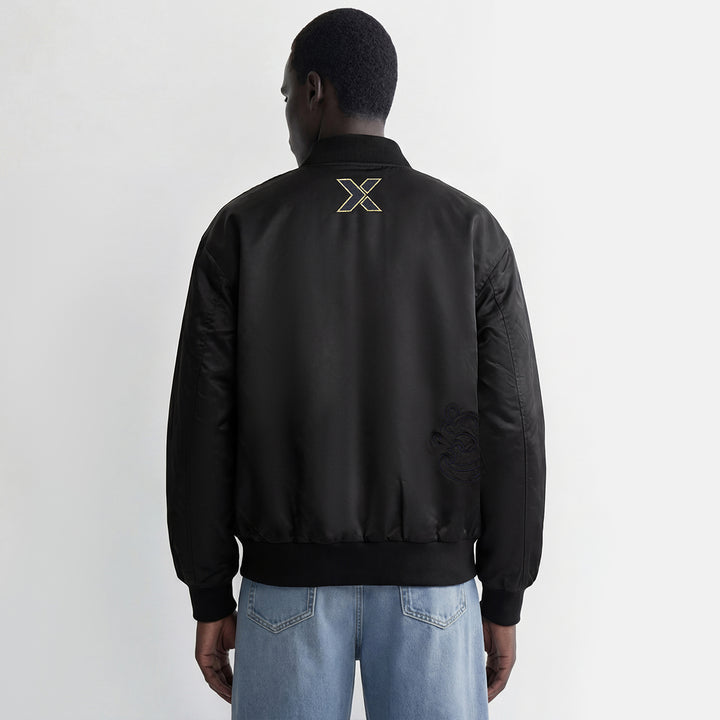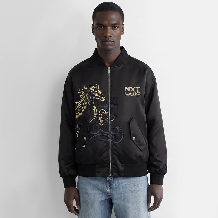 Classic bomber jacket silhouette crafted from nylon twill. Featuring a Fire Horse Year embroidery at the chest, highlighted with gold-thread stitching and paired with tonal embroidery details. A gold-thread NXTLABS logo adorns the left chest. Fully lined with 60gsm lightweight quilted fabric and finished with a relaxed, loose fit.